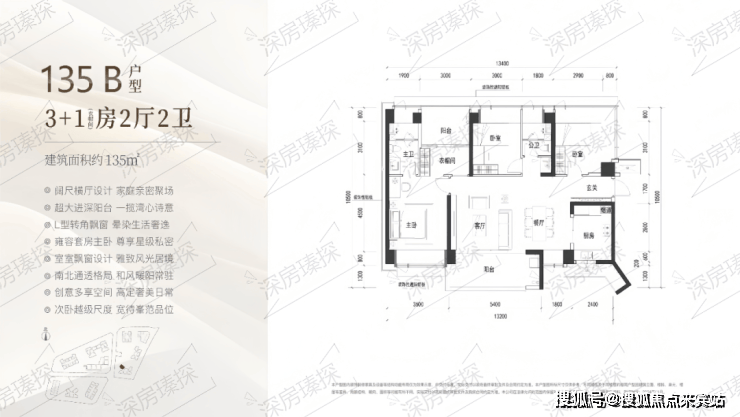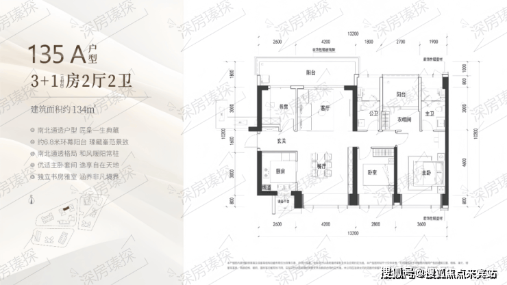 134㎡的4房2厅2卫,A户型(1栋1/2单元05户型),设计的是竖厅南北通透格局,进门入户玄关,客厅4.2米开间,LDKB一体化设计,四开间朝南,4个卧室分别做到了主卧19.44㎡/次卧10.64㎡/次卧10.26㎡/次卧7.8㎡(包含墙体飘窗),客厅连接次卧出6.8米长的观景大阳台看深大校区,U型厨房,卫生间干湿分离,得房率约90%(包含赠送),西北朝向。