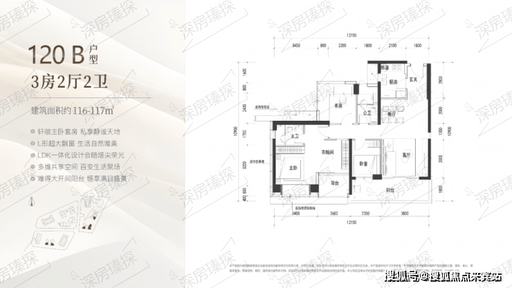 117㎡的3房2厅2卫,B户型(2栋4单元01.02.05/3栋2单元02/05户型),设计的是经典竖厅格局,客厅3.8米开间,LDKB一体化设计,3个卧室分别做到了主卧28.6㎡/次卧9.6㎡/次卧7.05㎡(包含墙体飘窗),客厅连接次卧出6.15米长的宽景大阳台,U型厨房,卫生间干湿分离,得房率约90%(包含赠送),东南或正东朝向。其实也可以改4房。