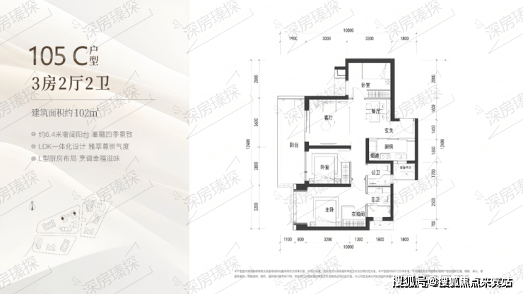 102㎡的3房2厅2卫,C户型(1栋1/2单元02户型),设计的是竖厅格局,客厅3.6米开间,LDK一体化设计,3个卧室分别做到了主卧16.93㎡/次卧9.24㎡/次卧8.96㎡(包含墙体飘窗),客厅连接次卧出6.4米长的宽景大阳台,U型厨房,卫生间干湿分离,得房率约90%(包含赠送),西南或东北朝向。