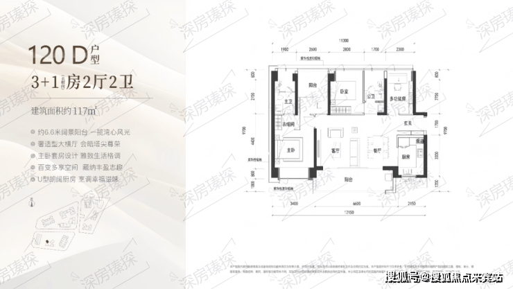 118㎡的4房2厅2卫,A户型(1栋1/2单元01户型),设计的是横厅格局,进门入户玄关,客餐厅6米开间,LDKB一体化设计,4个卧室分别做到了主卧17.65㎡/次卧11.02㎡/次卧9.12㎡/次卧8.74㎡(包含墙体飘窗),客餐厅出6米长的观景大阳台看深大校区,U型厨房,公卫三段式分离,得房率约90%(包含赠送),西北朝向。