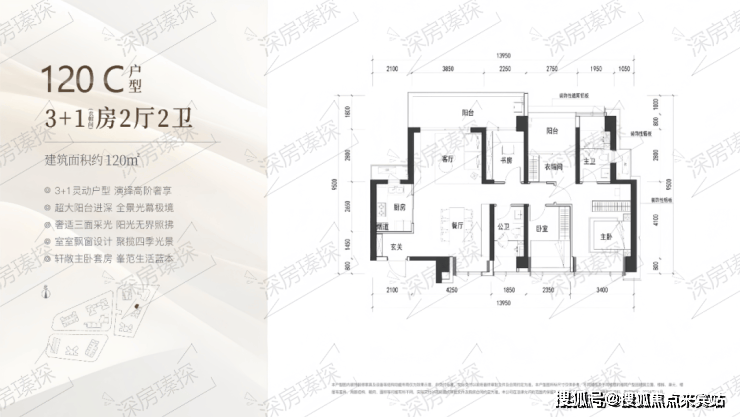120㎡的4房2厅2卫,C户型(2栋3单元01户型),设计的是竖厅格局,客厅3.85米开间,LDKB一体化设计,动静分区,4个卧室分别做到了主卧16.65㎡/次卧9.9㎡/次卧9.16㎡/次卧6.3㎡(包含墙体飘窗),客厅连接次卧出6.1米长的宽景大阳台,U型厨房,卫生间干湿分离,得房率约90%(包含赠送),西北朝向。