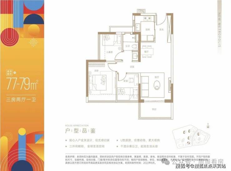 77-79平3房2厅1卫:经典竖厅设计,使用率77.65%(不包含赠送面积)