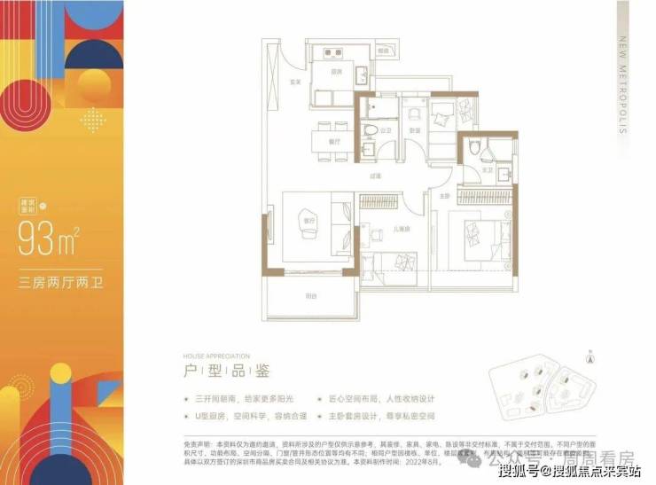 93平3房2厅2卫:经典竖厅设计,使用率77.66%(不包含赠送面积)