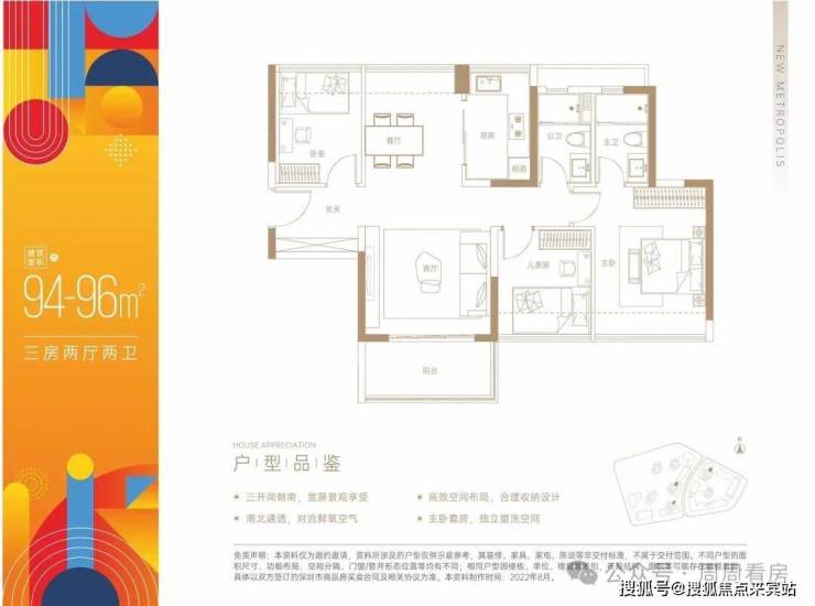 94平3房2厅2卫:南北通错厅设计,使用率77.66%(不包含赠送面积