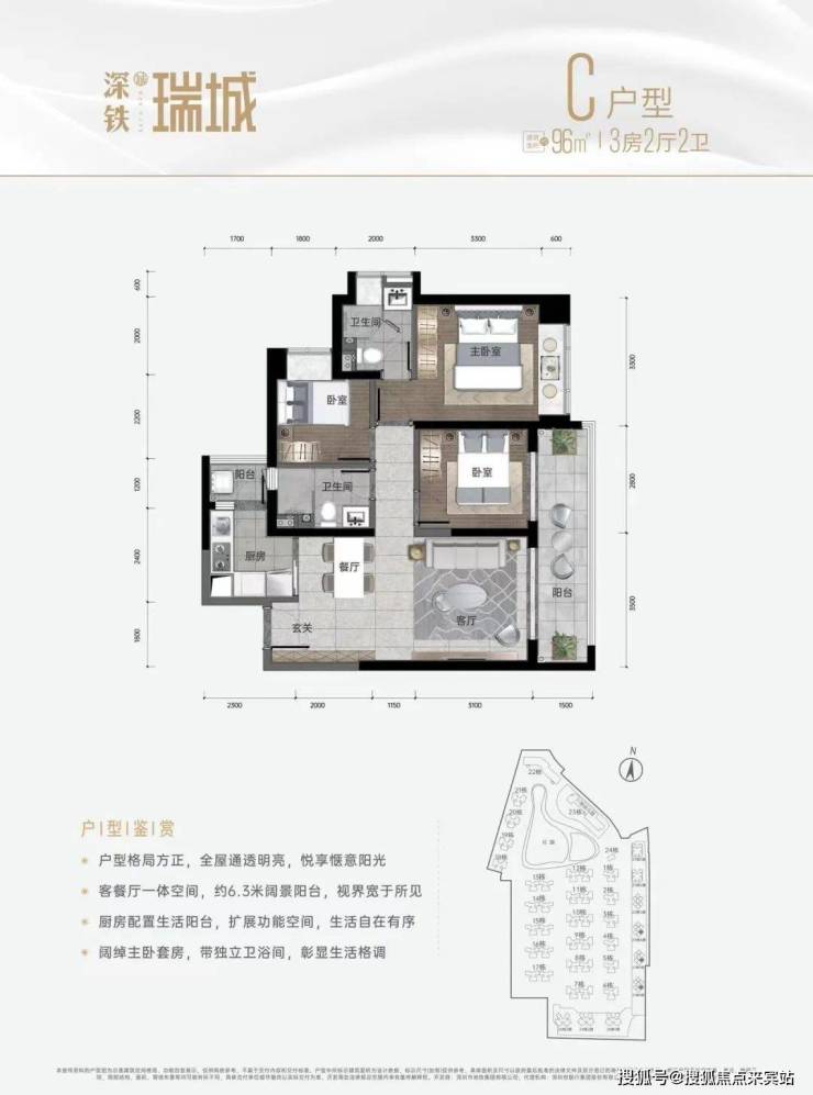 深铁瑞城,总占地面积约18.9万㎡,总建筑面积约64万㎡,计容建筑面积约57.7万㎡,容积率3.06,绿化率25%,项目共分3期开发,总规划4770户(其中商品房2770套,人才房606套,保障房1394套),停车位3202个(占比1:0.67)。