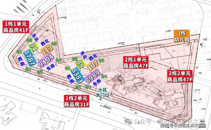 本次即将入市的星河盛境瑞府,由星河集团打造,总占地面积约1.83万㎡,总建筑面积约13.12万㎡,计容建筑面积约9.8万㎡,容积率5.17,绿化率40%,共由4栋31-47层高住宅组成,其中1栋1单元商品房41F,1栋2单元商品房31F,2栋1/2单元回迁房47F,3栋是1所幼儿园。