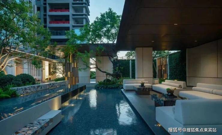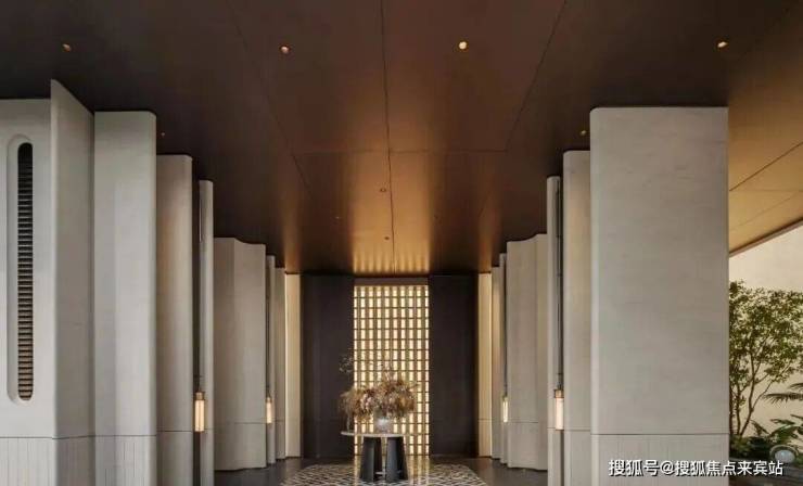 园林设计上,森系度假美学景观,公区质感跃级,优选石材、铝板、铝格栅等,入户大堂奢华感拉满。