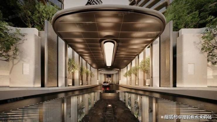 两侧9米净高桅杆造型立柱,搭配八株稀有乔木,暗藏“九五至尊、八方来财”的美好寓意;车马院天圆地方穹顶设计,自然天光透入,转盘水景随时辰、季节呈现不同水波斑纹,营造自然声息,穹顶上方更是衔接顶层园林,让立体园林的漫步空间延伸至归家第一站,岭南特色风水布局巧思,藏在每一个细节里。