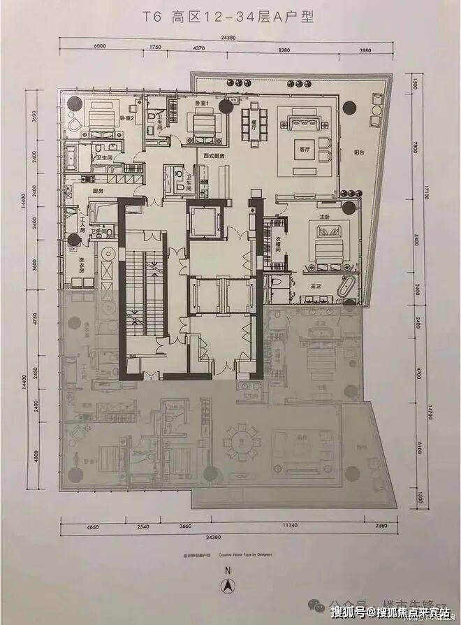 T6栋高区12-34层的330平A户型,由3个套房+2厅+1个工人房+1个书房组成。户型方正,客厅出V字型双阳台,视野非常开阔。动线合理,主佣分区,讲究私密性和礼节并重。