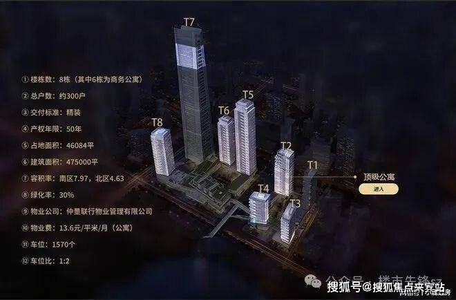 总共8栋,分为南北区。北区分为:T1写字楼、T2、T3、T4公寓。南区分为:T5、T6、T8公寓,T7为环球商务中心。