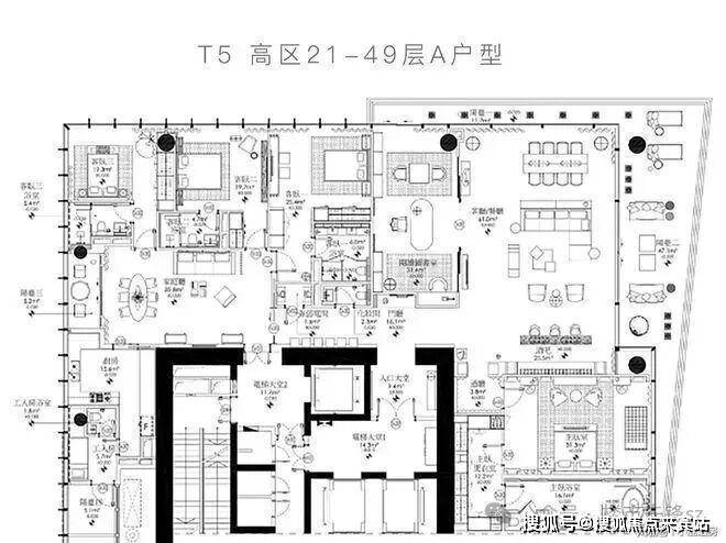 位于T5栋高区21-49层513平 的A户型,由4个套房+4厅+厨房+书房+工人房组成,其布局与T8高区330平A户型如出一辙。基本上就是面积大一点,此外还多了个卧室以及工人间浴室。均采用超大面宽设计,客厅出V字型双阳台,视野非常开阔。出于东面和北面景观的考虑,此户型采光面朝东和朝北。实现了主佣分区,动静分区不明显。