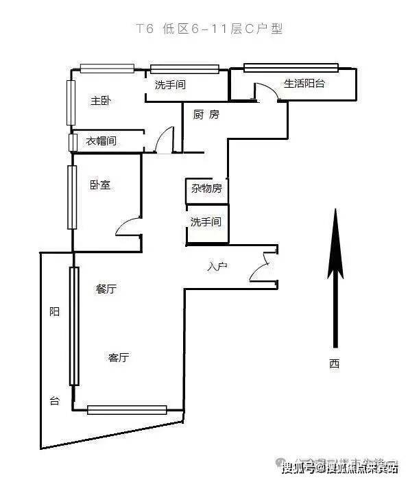 T6栋低区6-11层的240平C户型,为深圳湾一号入门户型,由2个套房+2厅+厨房组成。户型不方正,得房率低。客厅出L字型双阳台,视野开阔,主卧出朝东阳台,采光和视野都比较好,此外还配有生活阳台,可以观赏东面海景。不足之处在于阳台朝西和朝北,采光和景观都比较一般。主卧和厨房隔得太近,且未实现主佣分区,动静分区不明显。