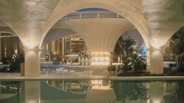 会所的立面采用了白色的曲线拱券造型,泳池从中穿过,蓝白相映,让人感受宁静而放松。作为国内首家使用迪拜风的社区会所,带来同纬度的气候和异域风情感,让住户的体验感再上一个阶层。