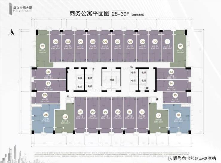 公寓8梯28户,办公6梯15户,商业4梯34户