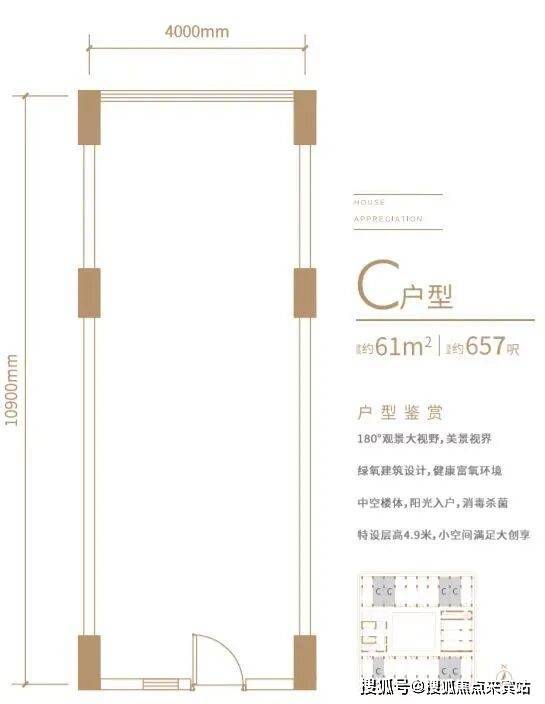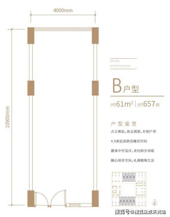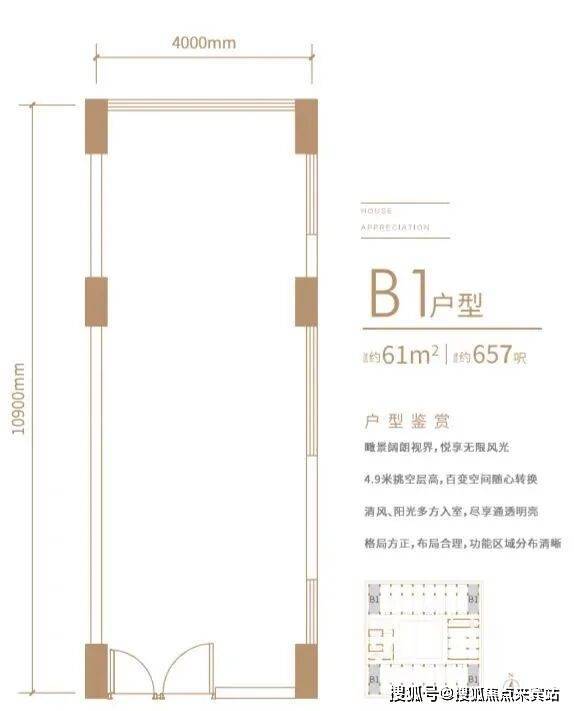 4.9 米层高,户型实用(约 60㎡),景观优越,空间利用率高。