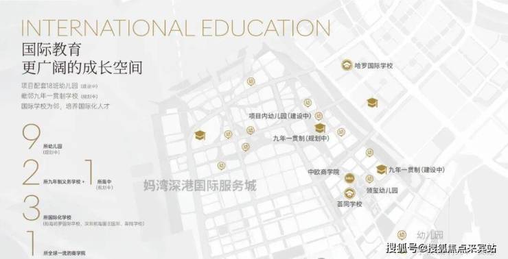 小区自带幼儿园,楼下就规划有一所九年制学校,周边有前海创新妈湾学校。另外还有哈罗港人子弟,哈罗国际及荟同学校等等,教育资源丰富多元。