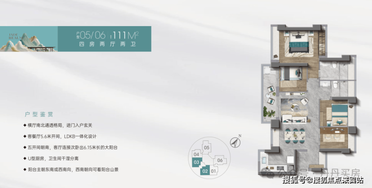 此户型为本次亮点产品,东南或西南朝向,经典竖厅设计,客厅3.7米开间,三开间朝南。客厅连接次卧出6.4米长的大阳台,为家庭休闲、茶叙提供理想空间。U型厨房操作流畅,卫生间干湿分离,主卧套房标配独立卫浴,完美契合改善型客户的核心需求。
