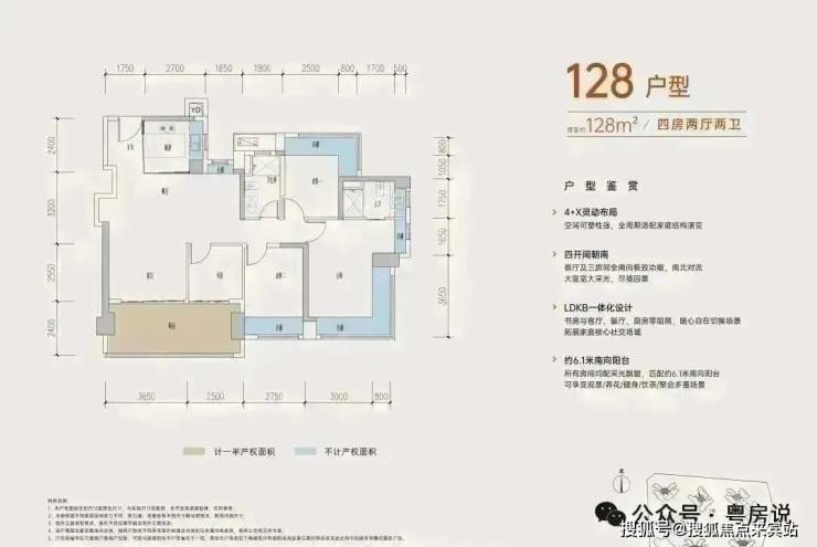 128㎡的4房2厅2卫,设计的是经典竖厅格局,进门入户玄关,客厅3.65米开间,四开间朝南,动静分区,主卧+1个次卧270度大飘窗,客厅连接次卧出6.15米长大阳台,4个卧室分别做到了主卧20.14㎡/次卧11.28㎡/次卧10.58㎡/次卧6.37㎡(包含墙体飘窗),得房率约:77.39%(不含赠送),东南朝向。赠送面积21.54㎡,加上赠送得房率94.45%。