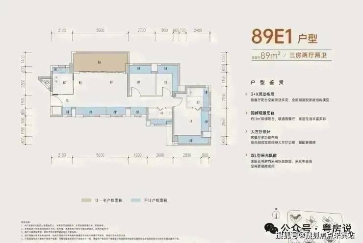 89㎡的3+1房2厅2卫,A户型,设计的是竖厅南北通透格局,进门入户玄关,客厅3.5米开间,,五开间朝南,主卧南北通透双飘窗,3个卧室分别做到了主卧15.73㎡/次卧14.08㎡/次卧8.96㎡(包含墙体飘窗),得房率约:77.39%(不含赠送),阳台主朝东北向,这次推出最靓的户型可以改4房,赠送面积24.5㎡,加上赠送得房率高达104.87%。