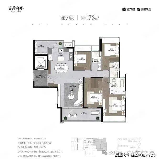 颐/璟 176㎡ —— 4房2厅3卫。板式独梯独户,央景花园大宅, LDKB一体化,南北双阳台通透对开放式中西厨,尽显大家之气,约6.7m宽瞰景阳台,多场景运用,延续生活空间,双套房行政级配置,带步入式衣帽间•奢适主卫