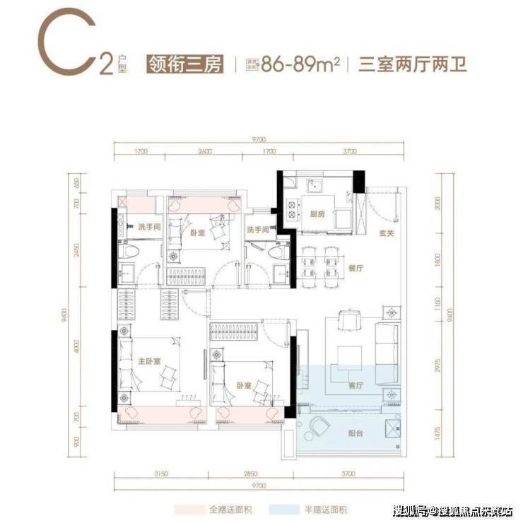 86-89㎡,三室两厅两卫 :板式户型,通透、采光,使用率最高;南向跨度,约9.7米向南,宽待家人;主卧套房,私密从容,精致生活体验;双卫生间,舒适使捷,互不干扰。