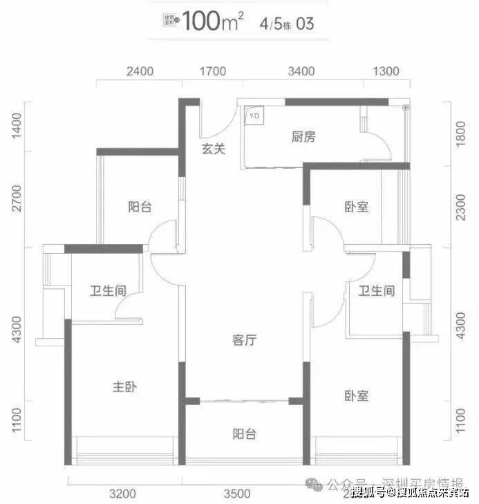 建面100平米:4房2卫朝南,传统的竖厅户型,动静分区格局,传说中的‘双龙抱珠’户型,在乎玄学的是潮汕人特别喜欢的户型之一;这种户型设计很合理,卧室在客厅的两边,卫生间的布局也很科学,减少了过道,空间利用率特别高。主卧不包括卫生间大小为11.5平米,比较适中,不过朝东的卧室只有4平米左右,做成卧室稍小,比较适合做成书房或者储藏室;这个户型的厨房利用空间大很多,还带有一个生活阳台。