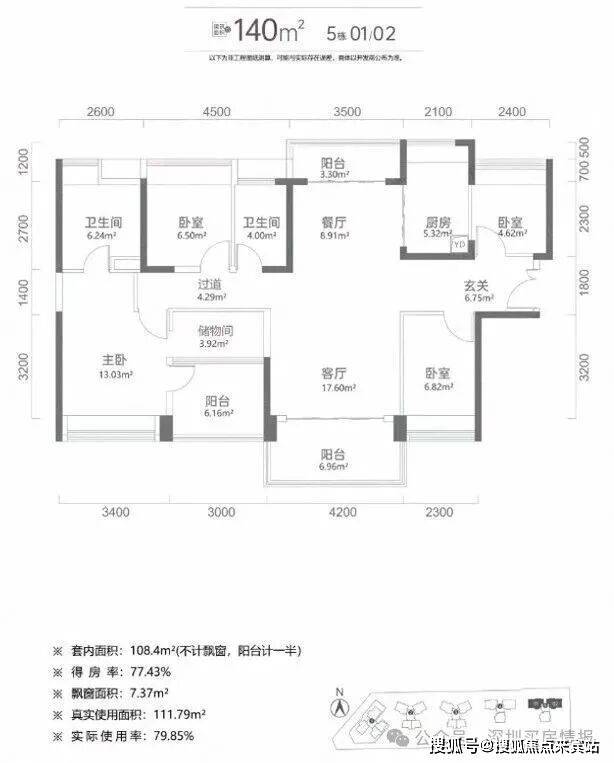 140㎡4+1房二卫:该户型是「总章翡翠公馆」的最大面积户型,实际上可以做到五房二卫。南山区很少有140㎡面积段做得出五房双阳台的设计,实际使用率也接近80%,南/北通透的户型非常舒服。