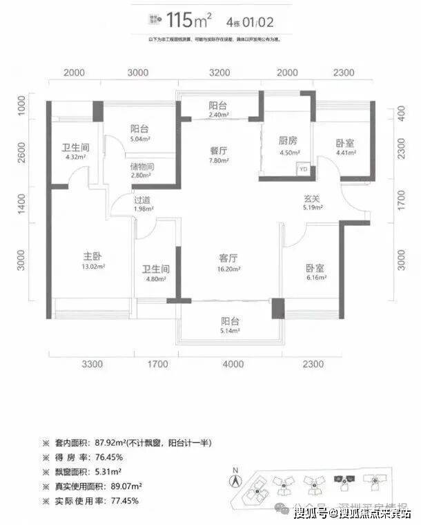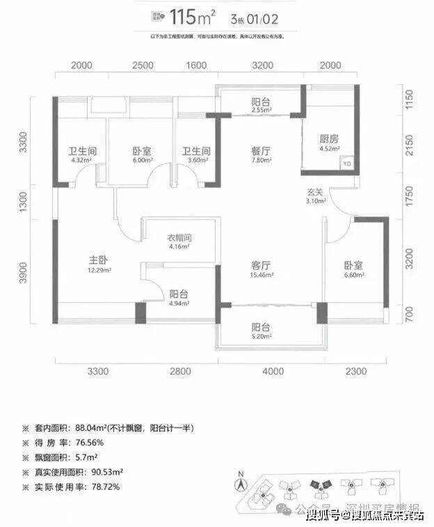 建面115平米:4房2卫,这种户型有3种朝向,3栋01户型西南/东北通透主阳台朝西南,3栋02户型东南/西北通透主阳台朝东南,4栋01/02户型南/北通透户型阳台朝南;