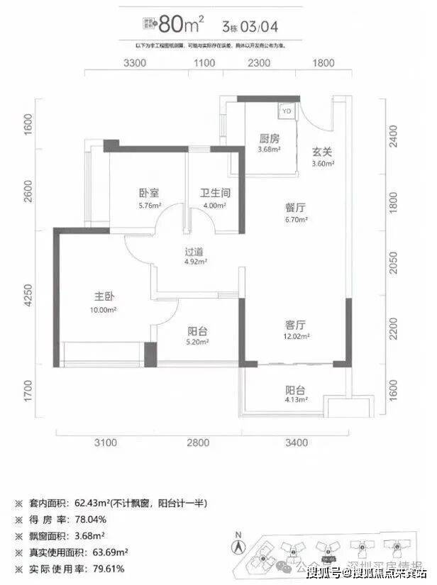 80㎡2+1房一卫:为了偷面积主卧旁设了阳台,实际上就是常规三房一卫户型。餐客厅18.72㎡,客厅开间3.4米,整个动区的观感应该还蛮阔绰。