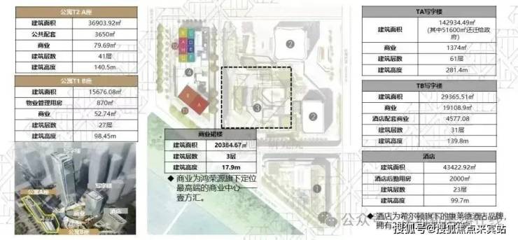 总建筑面积:超34万㎡(2栋甲级办公楼、1栋五星级酒店,2栋服务式公寓)