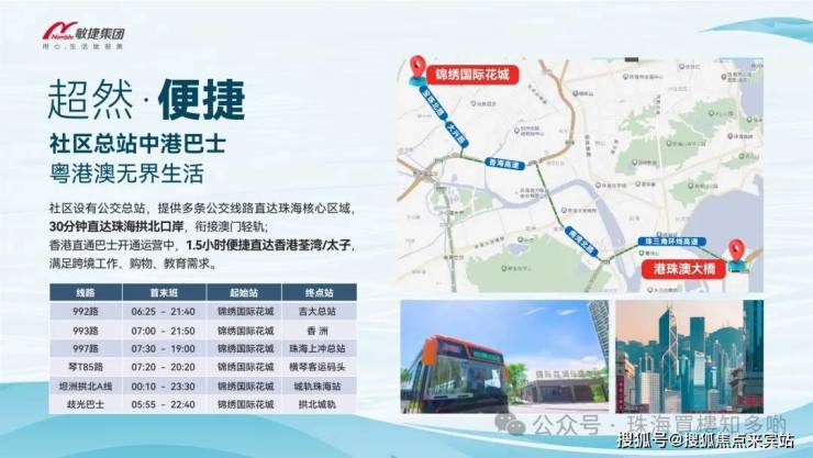 社区内有公交总站,接驳珠海;项目距港珠澳大桥直线距离仅约10公里;距广珠轻轨明珠站约9公里;家门口的快线——坦洲快线第一段工程已完工并通车,实现10分钟达中山市区,;宝珠北路正式动工(林东小学至锦绣国际花城路段;锦绣国际花城多维立体交通,实现无障碍接驳中珠港澳,是大湾区西最核心的发展圈。