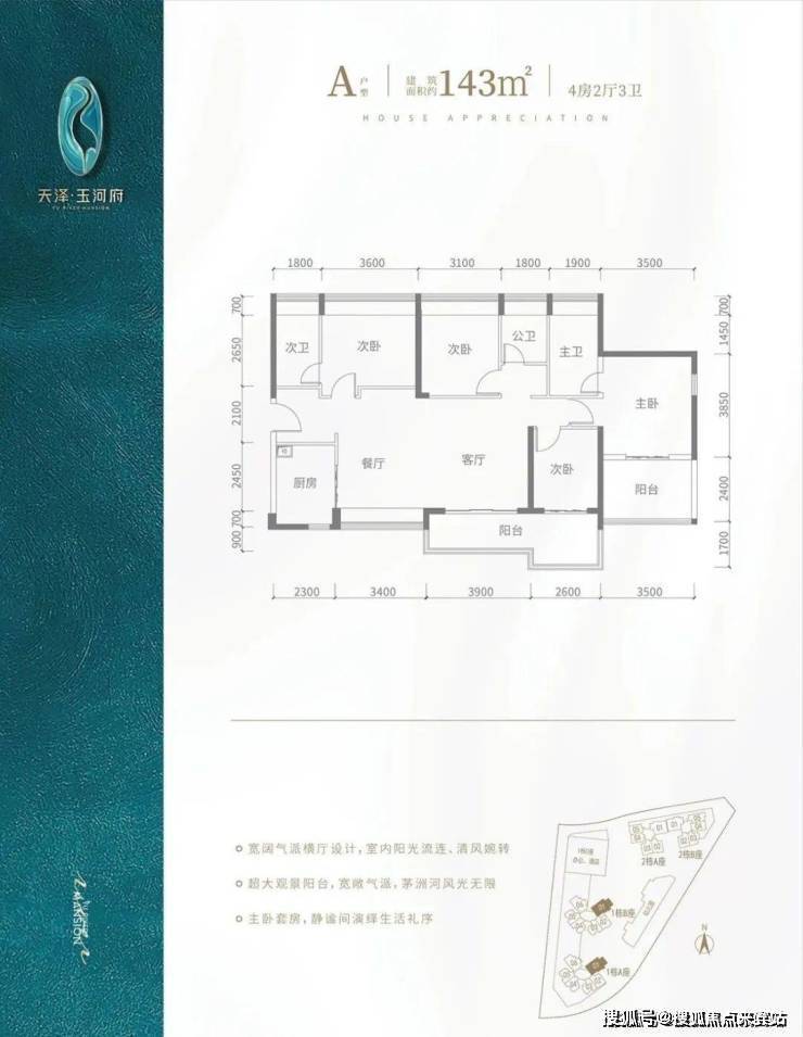 A户型-143㎡-4房2厅3卫,设计的是横厅南北通透格局,客餐厅开间7.3米,超大观景阳台6.5米长,全屋飘窗设计,主卧套房设计。