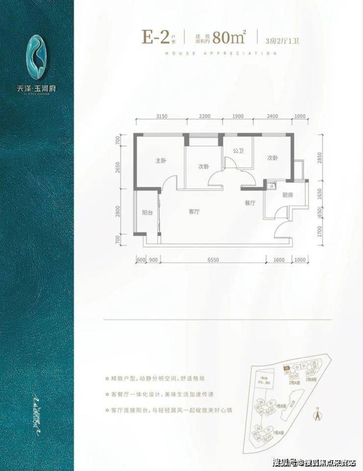 E2户型-80㎡-3房2厅1卫,设计的是竖厅格局,客厅3.5米开间,餐客厅一体化,阳台2.8米长,朝西向。