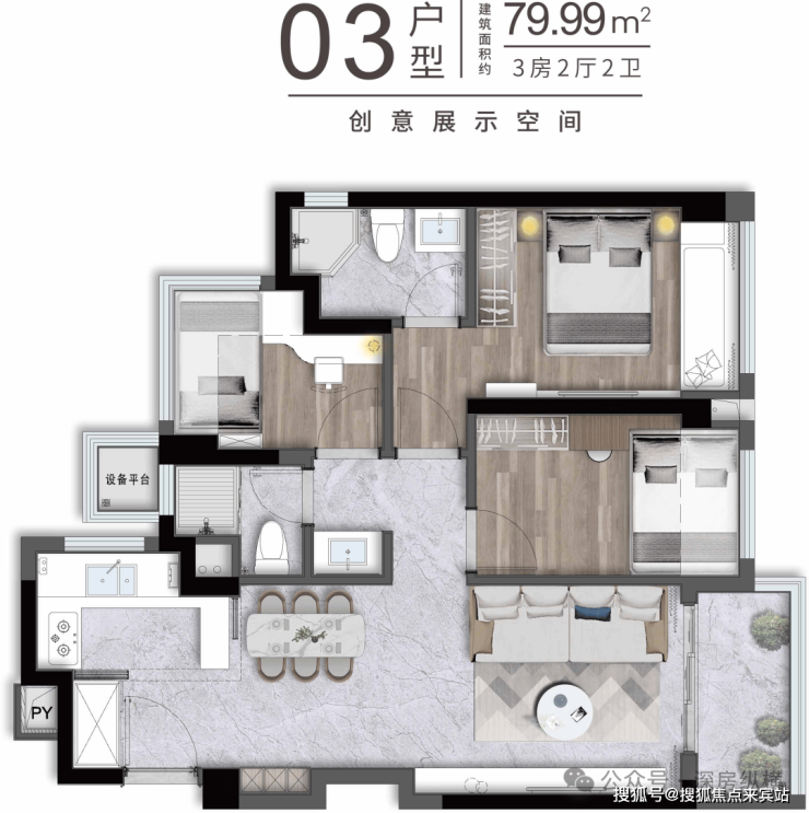 约80㎡:3室2厅1厨2卫,总价约511-545万;