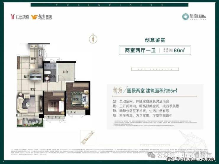 建面86平三房一卫,南区1栋,项目将厨房一面墙设计为非承重墙,三开间朝南设计,在售北区和南区,南区总价24X万起。