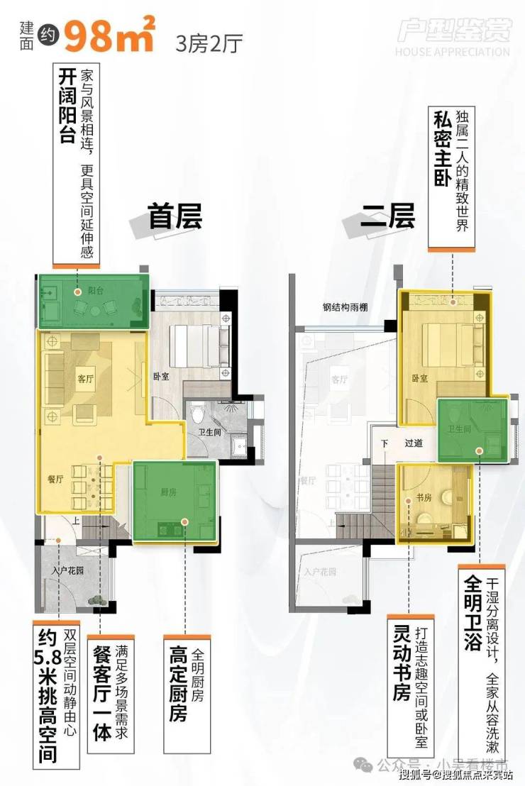 建面98平复式,5.8米挑高,阳台、客厅挑高都是5.8米,单层约2.8-2.9米,客厅开间约3.5米,三进式大主套,在售北区,总价340多万。