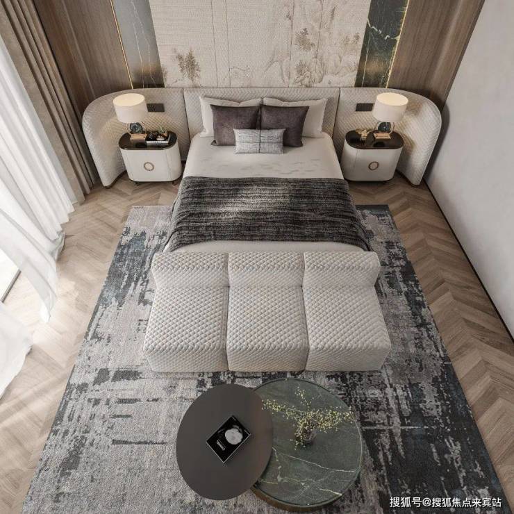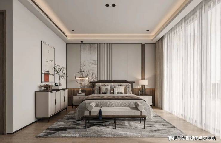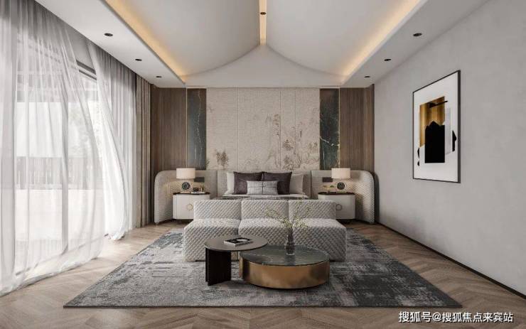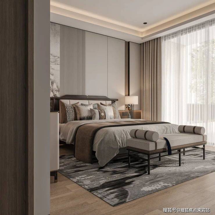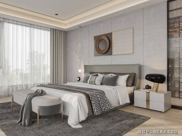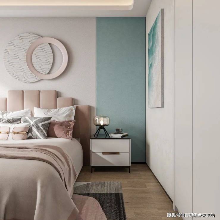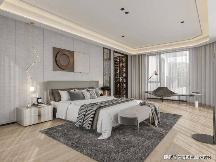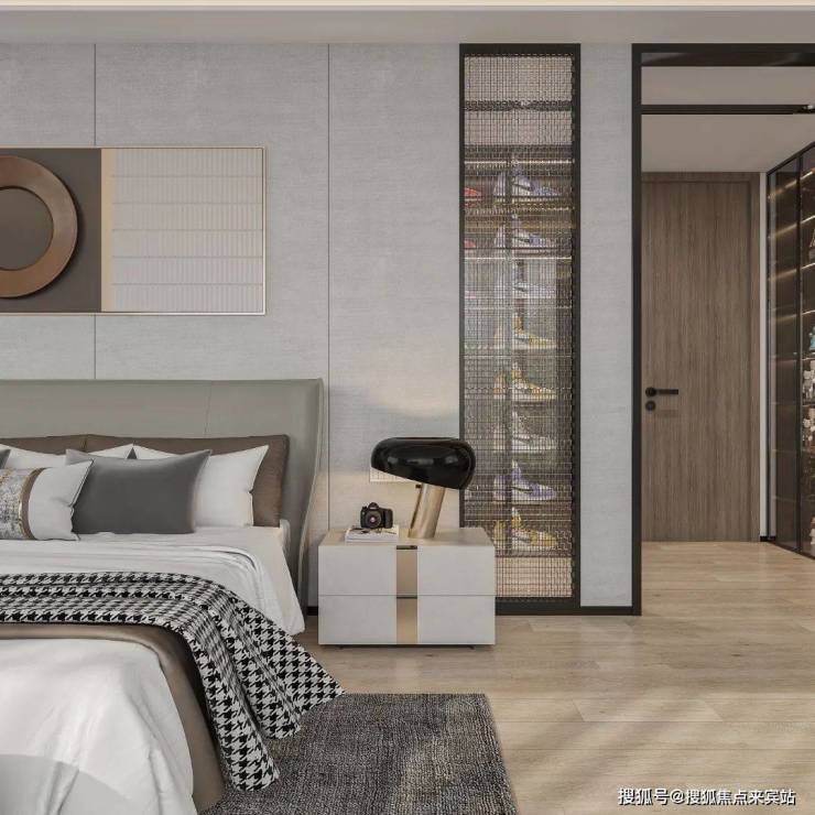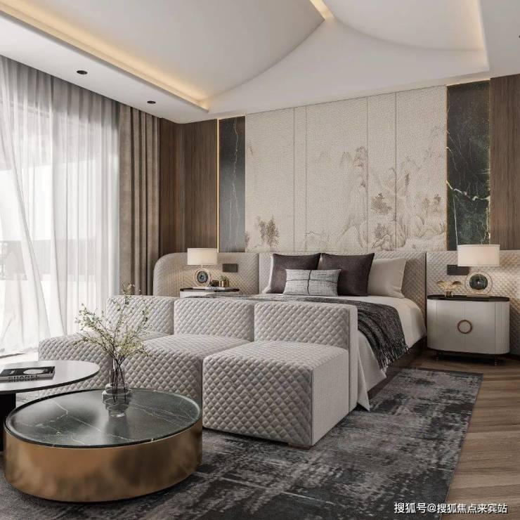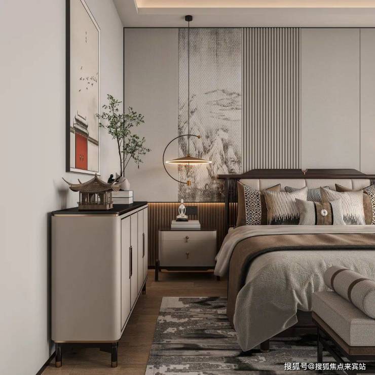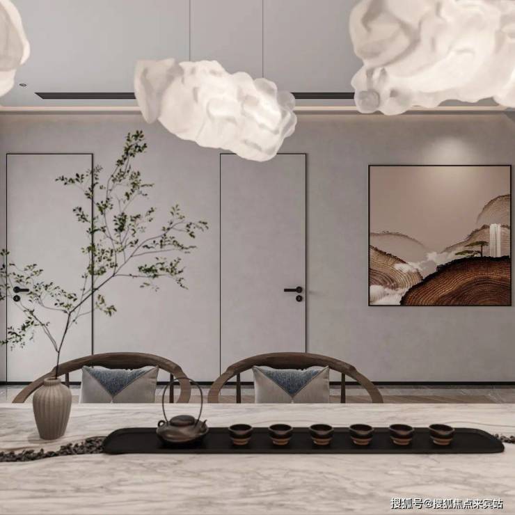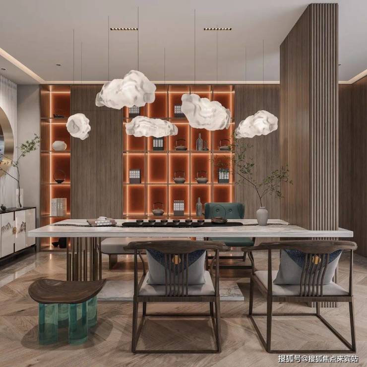寻觅本真与经典之间的共通点,以立体格状雕饰装点床头背景,衍生形态,珍珠项链般的艺术灯焕发时尚格调与轻盈美感。云叶之意,和安之绪