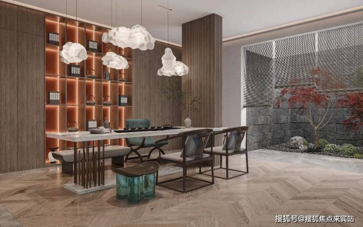 变换空间,加重体量,穿插至圆形顶面,打造出当代园林的审美意涵。通透质感,拟态水元素,叙述春夏秋冬的多重韵境,为品茗时光注入自然哲学。时光知味,岁月沉香。