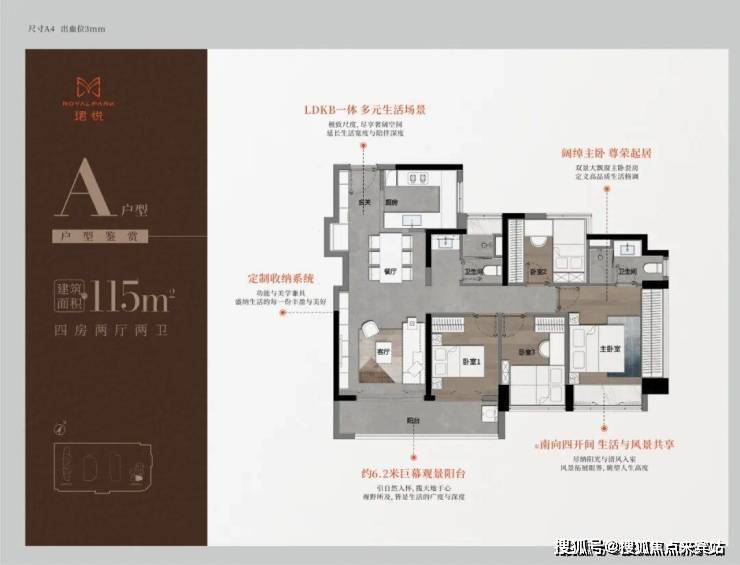 115㎡的4房2厅2卫,A户型(1栋1单元05户型),设计的是经典竖厅格局,进门入户玄关,LDKB一体化,S墙设计预留冰箱卡槽位,四开间朝南,动静分区,主卧双面飘窗,客厅连接次卧出6.2米长的巨幕大阳台,U型厨房,公卫三段式分离,得房率76.77%(不含赠送),套内面积88.71㎡,东南朝向,靓点是2个最小的次卧都不用睡飘窗。