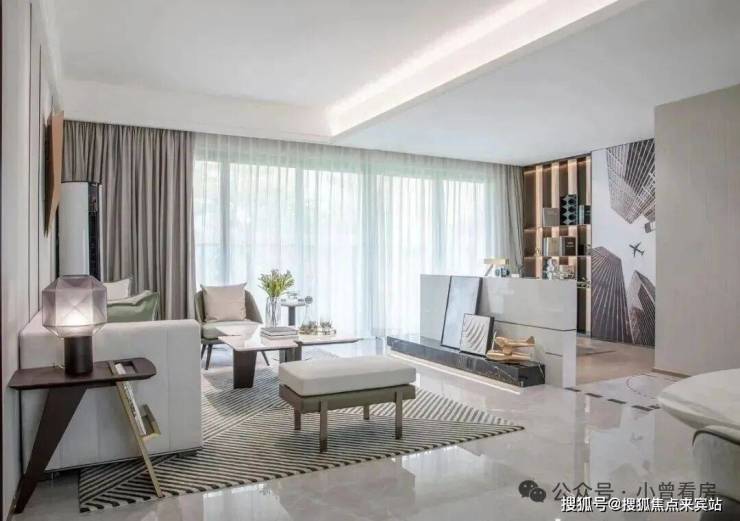 114㎡的旅游样板间更加摩登现代,客厅以黑白灰为主色调,低调优雅,明亮的黄色跳跃其中,让人眼前一亮。
