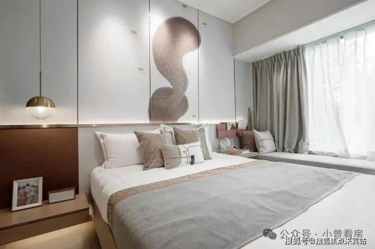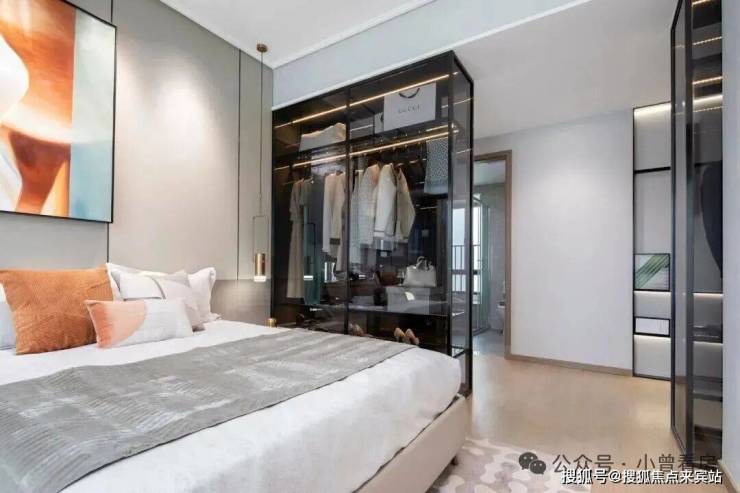 主卧榻榻米上摆放着唱片机,沙发与床相对,空间建立起人与人之间的情感交流。睡前十分钟,放下手机,在沙发上听歌品酒,看窗外夜景,你会发觉世界似乎也很动听。