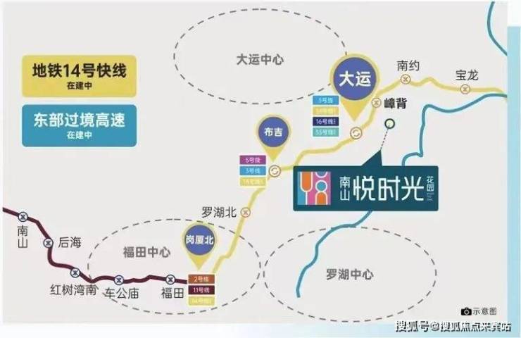 项目距离14号线快线南约站约2公里,步行30分钟,楼盘配套有公交首末站,可直达地铁14号快线南约站,2站到大运,9站到福田,30分钟直达福田中心。