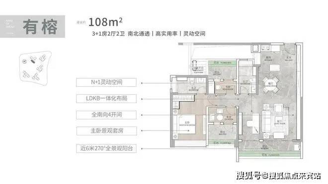 建面 108 平 3+1 房,四开间朝南,近 6 米的南向阳台,拥有 270 度景观视野,可尽情欣赏周边美景。LDKB 一体化设计,打造出 5.9 米的大方厅,空间开阔,增强了家庭成员之间的互动性。奢阔大主套设计,配置南向大飘窗,不仅增加了室内空间感,还能享受阳光与美景;独立卫浴和 L 型衣帽间,提升居住的私密性与品质感。
