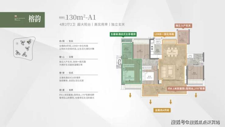 建面 165 平 4+1 房大平层,双阳台南北对流,通风顺畅。四开间朝南,中式厨房与独立西式岛台的搭配,满足不同烹饪需求。三面望山景,朝南面宽达到 17.4 米,近 9 米的 L 型景观阳台,将自然美景尽收眼底。双主套设计,保障家庭成员的私密性,主卧同样配备 270 度折叠屏飘窗,尽享舒适与奢华。