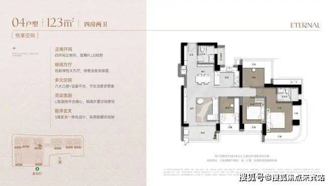 采用双龙抱珠格局,灵活适配成长型家庭。LDKB一体式布局,配备270°环幕主卧套房、U型厨房及七大飘窗,空间动静分离,实用且可变。