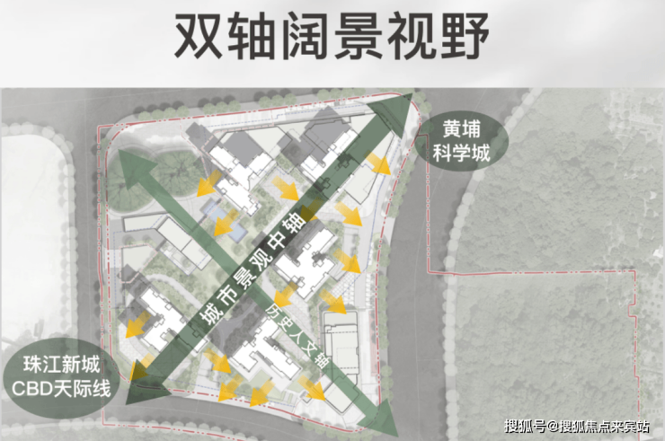 楼型48°设计,形成极致景观视野,目之所及皆风景;双轴景观中轴,一轴历史人文生活轴线,一轴珠江新城CBD与黄埔新城磅礴天际线,一览无余