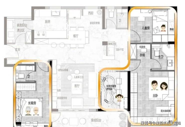 比如尤安设计的融创华南 I AM I • 90后新生代129产品,非常优秀。老人卧套与主卧套分别位于公区客厅两侧,避免两代人生活干扰,并且拥有独立的生活空间:老人卧套自带0.5卫、收纳空间、兴趣空间、以及直通景观阳台。