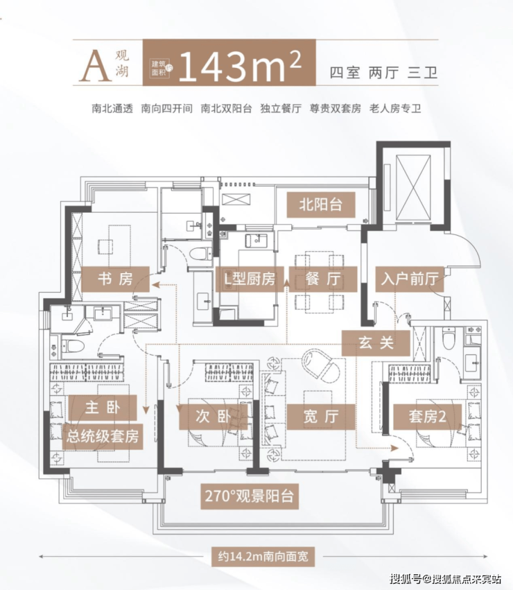 中海·新川华府建面约143㎡套四双卫户型,在做了“约7.2米大横厅+L型景观阳台”设计的同时,也是配置了“双套房”。