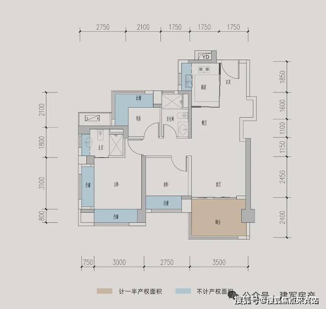 87㎡的3房2厅2卫,B户型,设计的是经典竖厅格局,进门入户玄关,客厅3.5米开间,LDKB一体化,动静分区,三开间朝南,S墙设计预留冰箱卡槽位,主卧+1个次卧270°飘窗,U型厨房,卫生间干湿分离,得房率约:77.4%(不含赠送),西南朝向。套内面积67.51㎡+赠送面积16.96㎡=实得84.47㎡,加上赠送得房率96.83%。