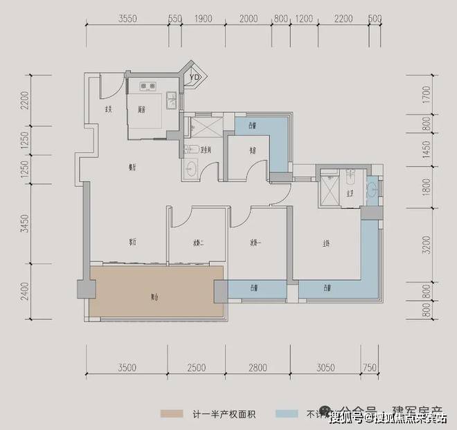 88㎡的3房2厅2卫,E1户型,设计的是横厅南北通透格局,进门入户玄关,客餐厅5.6米开间,LDKB一体化设计,客餐厅出11㎡的大阳台,主卧+1个次卧双飘窗设计,全屋12面飘窗,L型灵动式厨房,卫生间干湿分离,得房率约:77.4%(不含赠送),阳台主朝西北向。也是可以改4房的格局,套内面积68.64㎡+赠送面积24㎡=实得92.64㎡,加上赠送得房率104.45%。